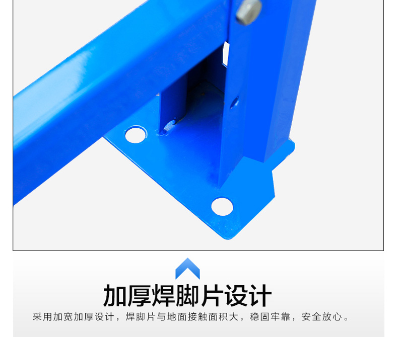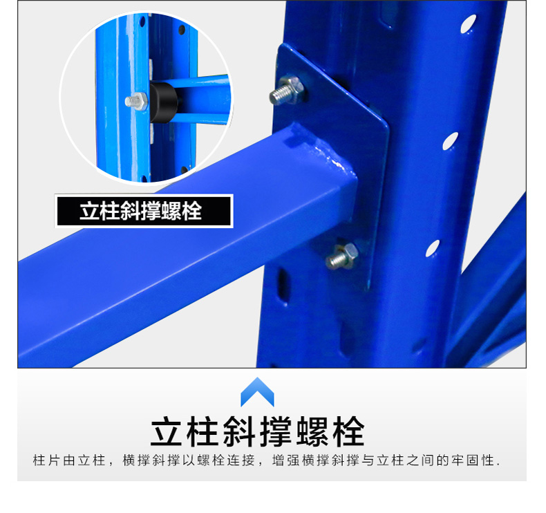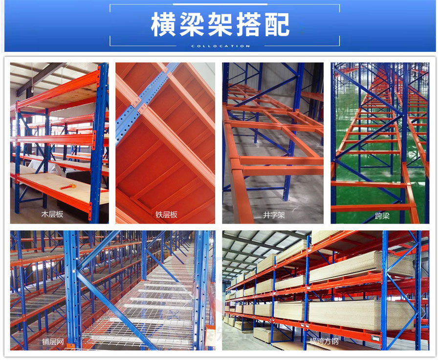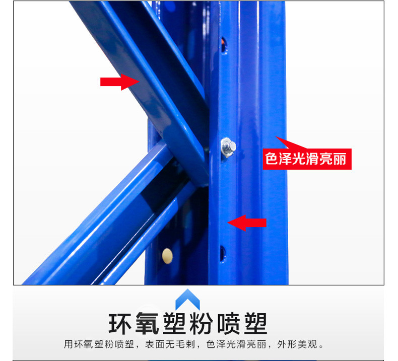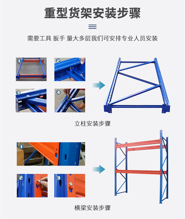 重型货架由立柱、横梁、横撑、斜撑以及自锁螺栓组装而成,可以有效防止螺栓松动后引发货架失稳;横梁采用特制的冷轧P型闭口梁;该结构具有简单可靠、重量轻、承载力强、造价低的特点;柱卡与立柱连接时配有特殊设计安全销,可以确保横梁在外力撞击下不会脱落;层板采用国际上做的条状层板,具有承载力强、耐磨损、更换简单、维修成本低廉的特点。重型(横梁式)货架一般采用冷轧异型钢制作,立柱由80(90)x60(70)Ω型钢表面冲菱形孔而成,横梁由80x50-100x50-120x50-140x50-160x50抱焊梁连接挂件而成,一般用托盘代替层板方便叉车搬运。层载重1吨到5吨的设计,表面静电喷塑,防水防锈防腐蚀能力更强,安全系数高,插接式组合,不需要用螺丝和焊接,组装非常方便,充分利用空间面积,提供仓储能力。
